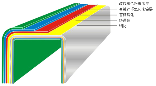 熱浸鋅:起到電化學保護作用,由內到外防止鋼鐵基材的生銹。